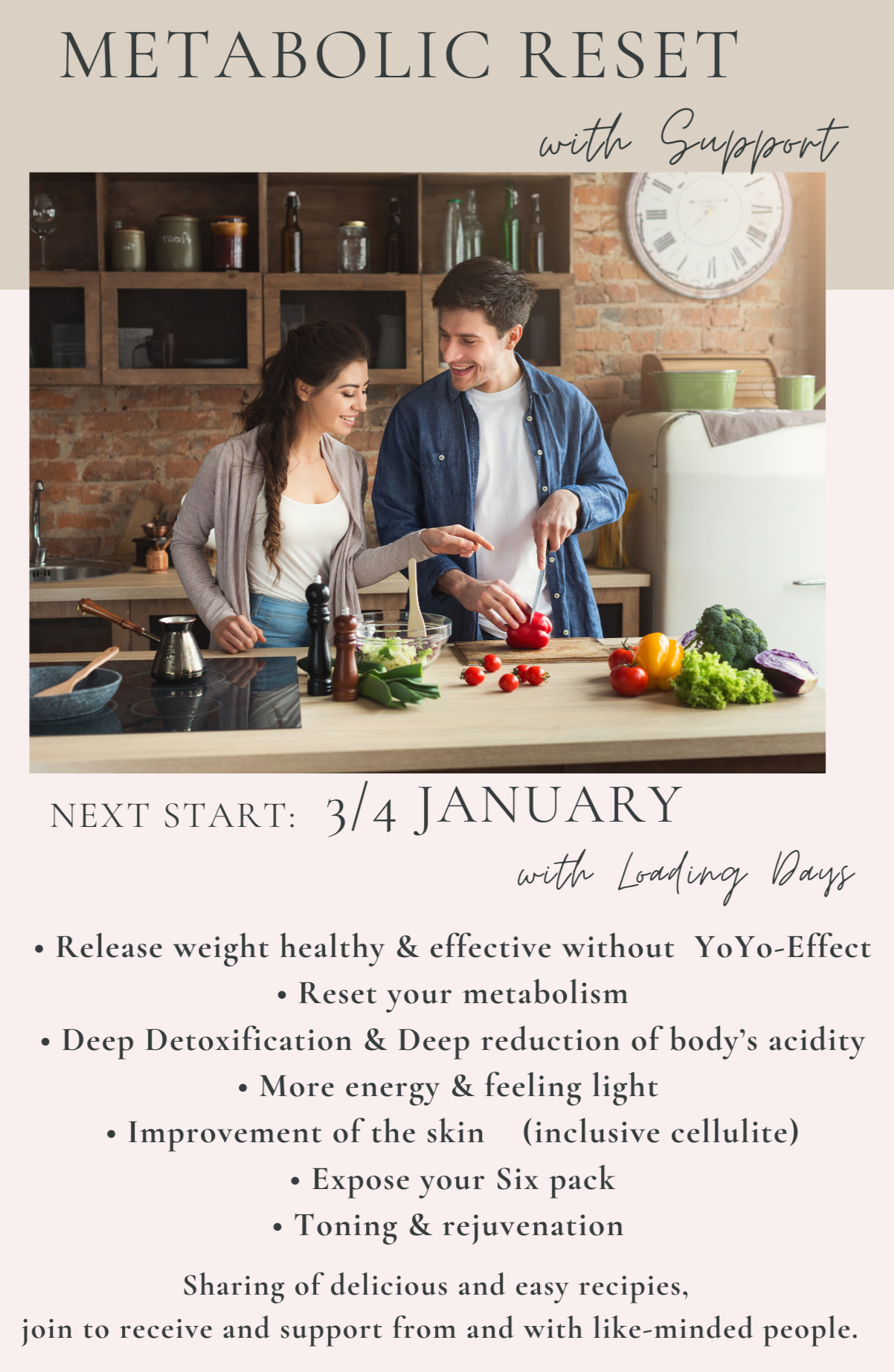 The next metabolic reset group programme with free support, guidance and share of recipes in a group starts: